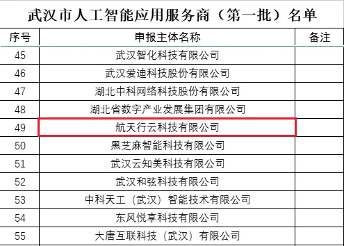 航天科工九院行云公司入選武漢市人工智能應用服務商認定名單