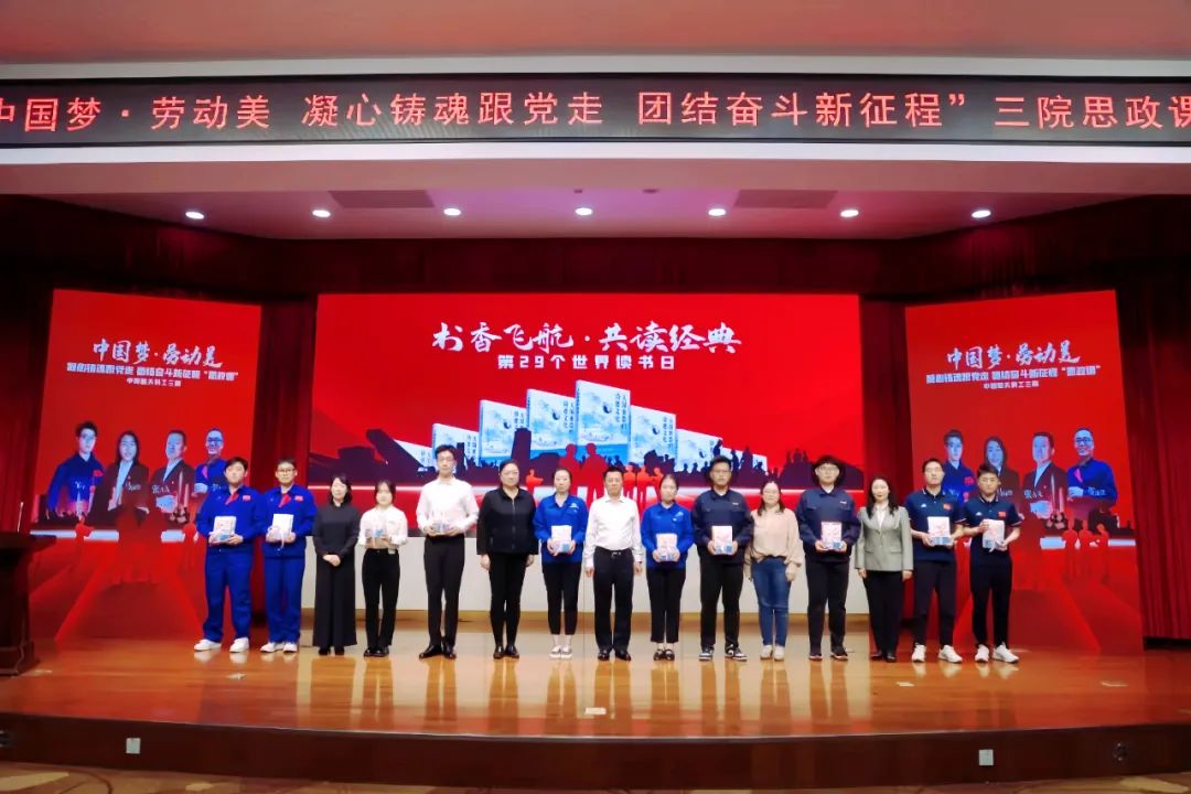 思政課舉辦之際,正逢中國航天日和世界讀書日,三院工會根據全國職工書屋開展千萬職工共讀經典主題活動的安排,在思政課現場,向全體職工推介《大國重器的詩意文化》一書,在場領導向職工代表贈送《大國重器的詩意文化》等書籍。