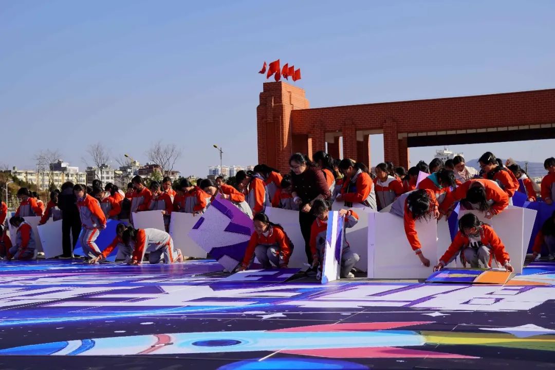 在知識尋寶環節,500多位女童參與航天知識競賽,通過答題獲得一塊屬于自己坐標的追夢大拼圖,根據手中拼圖的坐標在操場上找到相應位置,最后共同完成“航天筑夢未來 佑我春蕾圓夢”拼圖。